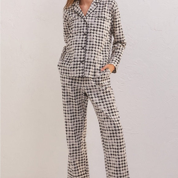 Houndstooth heaven! The Dreamer Houndstooth PJ Set is made using our Cotton Twill Flannel fabric with a houndstooth print and features a classic collared, button-up top and relaxed, pull-on pj pant with pockets. Fabric Content: 100% Cotton Machine wash cold, gentle cycle, wash dark colors separately, do not bleach, tumble dry low. Relaxed Fit. Top- Bust: 46" Length: 23.75" Sleeve Length: 18.5" Bottoms: Waist: 28" Inseam: 27.5